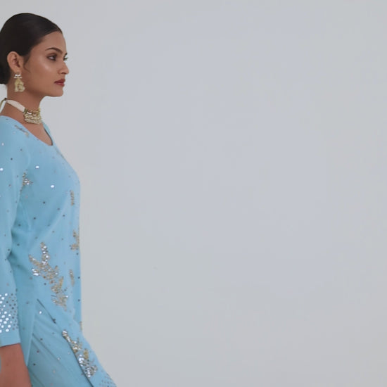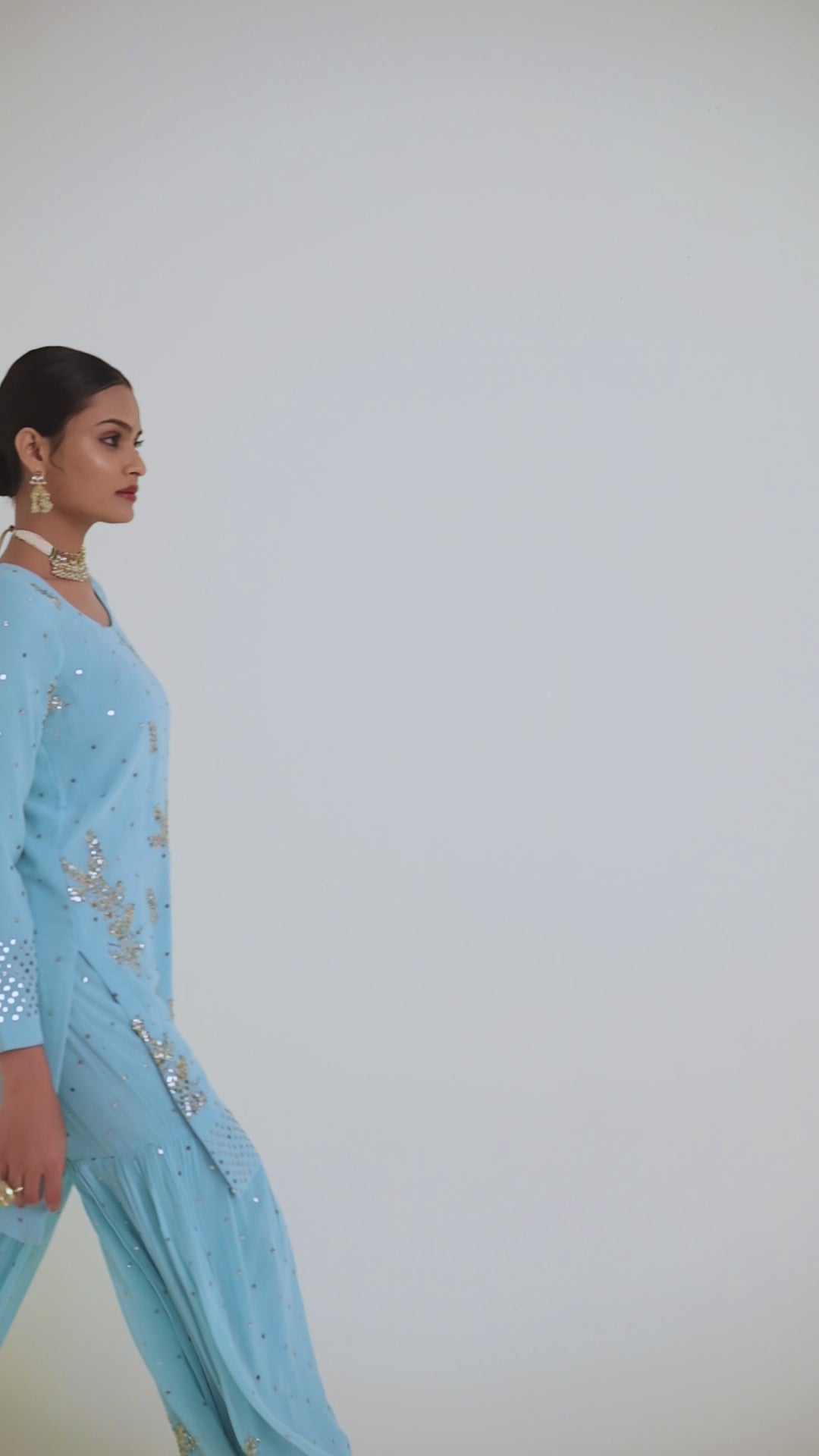 Dyeable pure georgette garara set with mukaish work is fashioned of luxuriously soft georgette fabric, making it a perfect choice for elevated occasions. Its lightweight feel is graceful and drapes elegantly, while its regal silhouette exudes a timeless and sophisticated air.